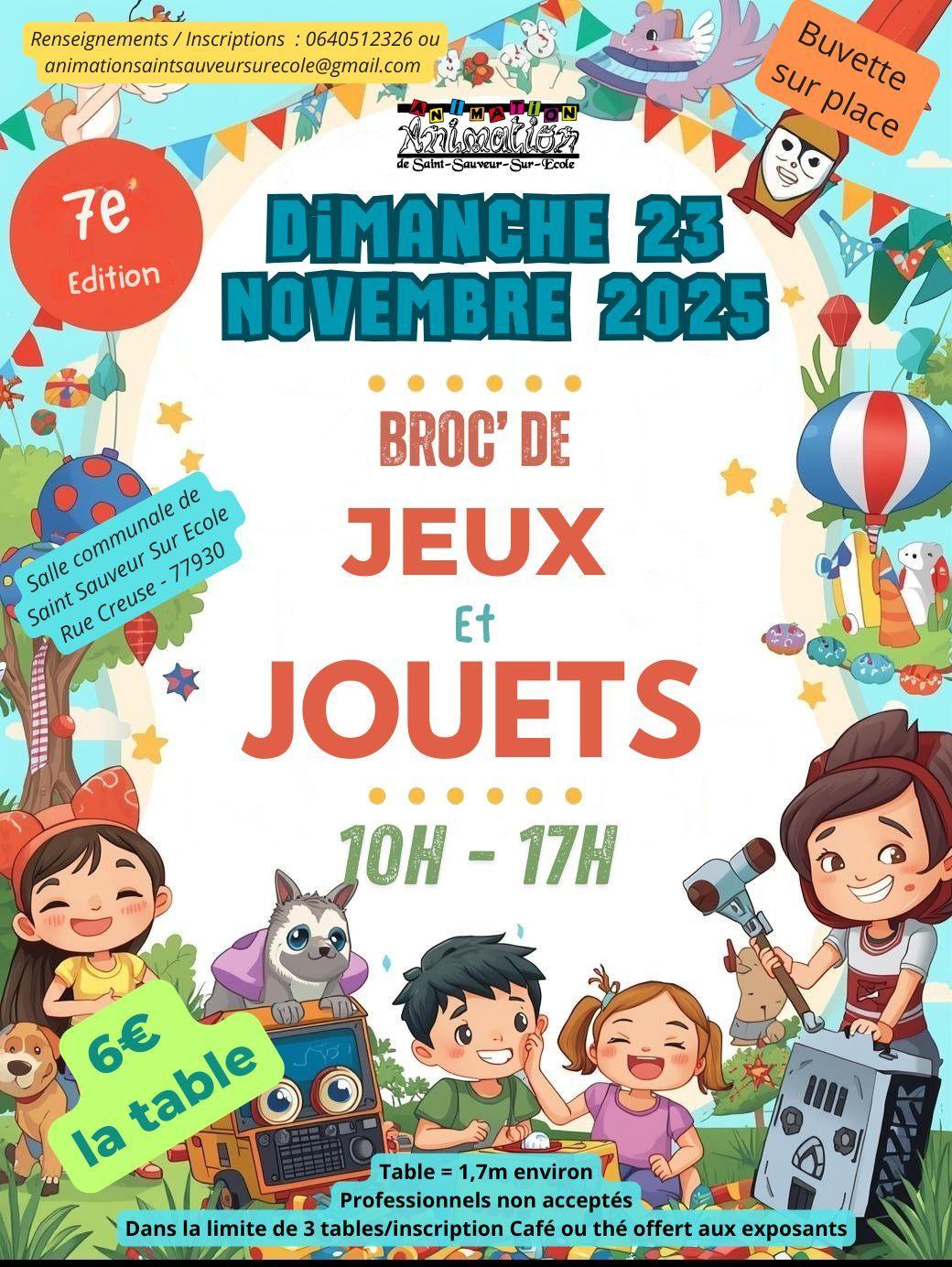 Solidarité Broc' de jeux et jouets 7e édition dimanche 23 novembre 2025 de 10h à 17h salle communale de Saint Sauveur sur Ecole Date de publication de la page et auteur de publication Créé le : 16/10/2025 Précédent Retour à la liste Suivant