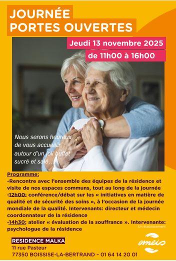 Toute l'actu Journée portes ouvertes à la résidence Malka le jeudi 13 novembre 2025 de 11h à 16h 11 rue Pasteur à Boissise-la-Bertrand. Date de publication de la page et auteur de publication Créé le : 28/10/2025 Précédent Retour à la liste Suivant